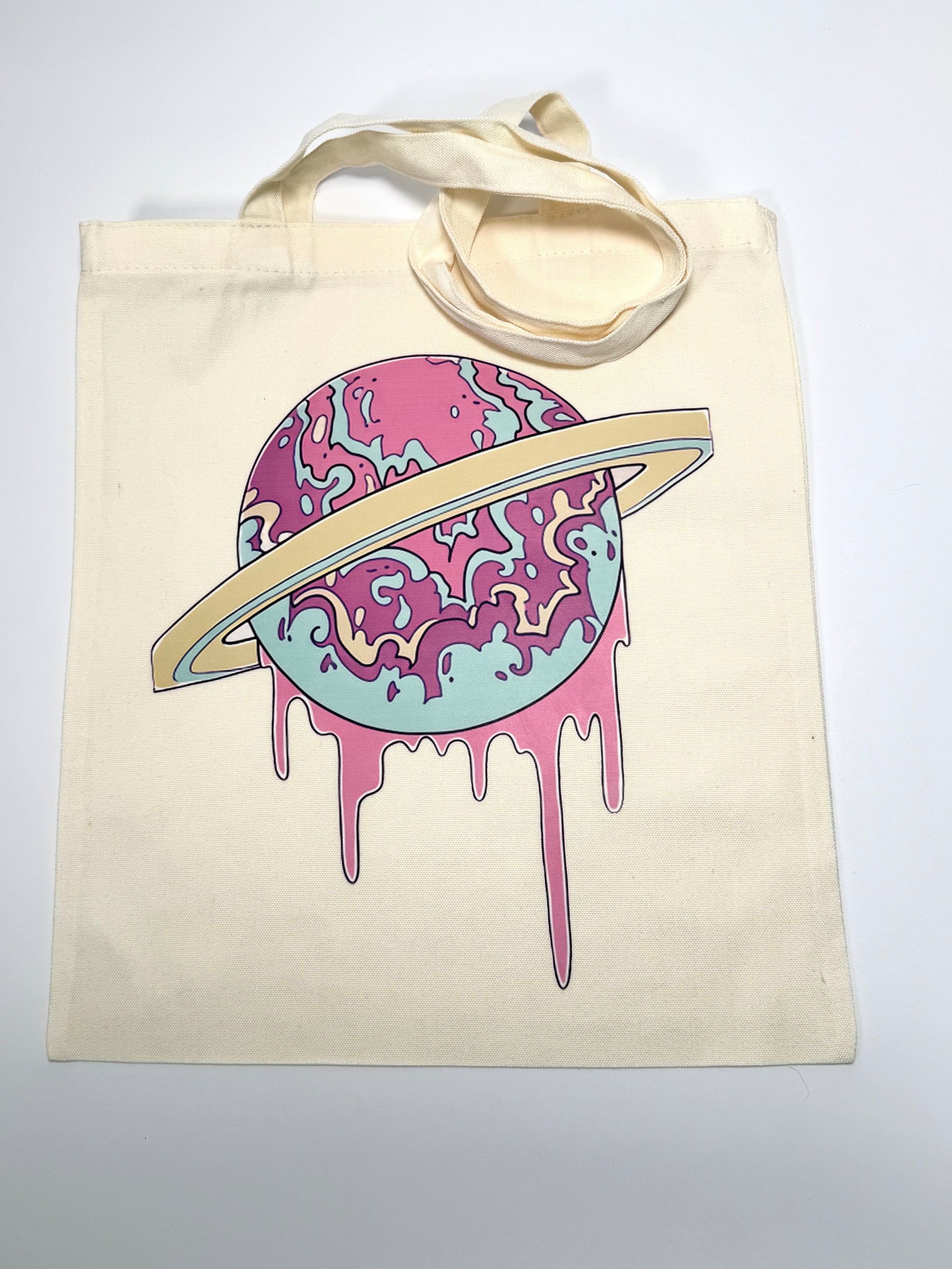 Carry your universe in style. The Melt the World Tote pairs cosmic whimsy with everyday function, featuring a dreamy pastel planet swirling in pinks, blues, and soft gold, dripping with otherworldly charm.